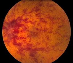 视网膜中央静脉阻塞的发病原因老年人与青壮年有很大差异,前者绝大多数继发于视网膜动脉硬化,后者则多为静脉本身的炎症。视网膜动脉硬化常见于慢性进行性高血压病或动脉硬化;静脉炎症可由静脉周围炎(Eales病)、葡萄膜炎症、Behcet综合征、结节病、Coats病、脓毒性栓子等引起,但临床上找不到明确原因者,亦非少见。