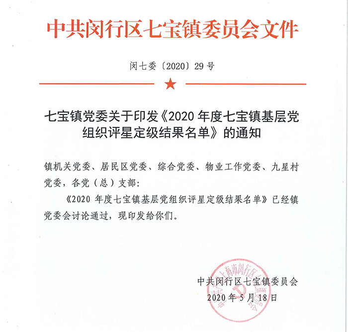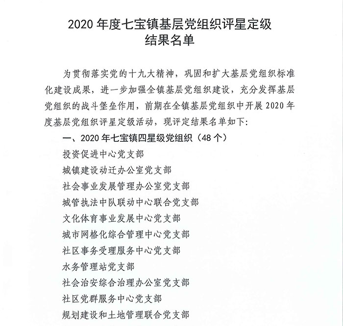基层党组织星级评定,是闵行区加强基层党组织规范化建设的一项重要举措。星级党组织评选秉承公平、公开,公正为原则,结合评星定级参考标准,严格评定,四星级是中共闵行区七宝镇委员会评定的最高等级。