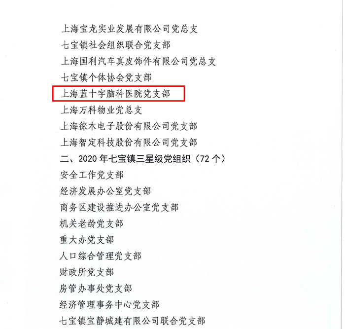 近日,中共闵行区七宝镇委员会下发《2020年度七宝镇基层党组织评星定级结果名单》的通知,上海蓝十字脑科医院党支部获评“四星级党组织”殊荣。