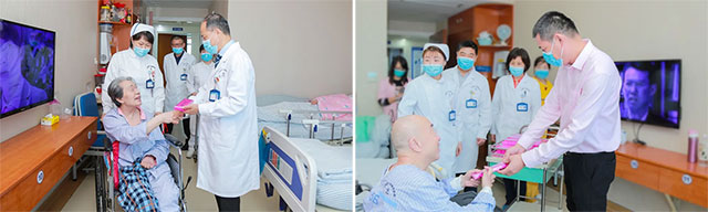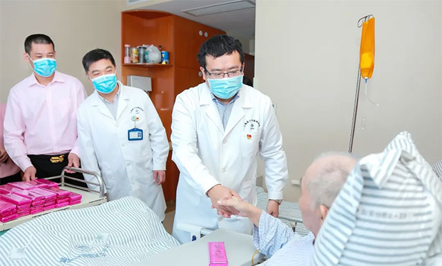 5A病区88岁患者张大爷,是一名老党员,一见到前来送重阳糕的朱敏书记和院领导们,连声说着“谢谢!谢谢!”