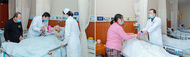 每到一个病房,院领导们都会送上节日祝福和精心准备的重阳糕,并与老人及家属亲切交谈,询问他们病情恢复情况及对医院服务的感受。