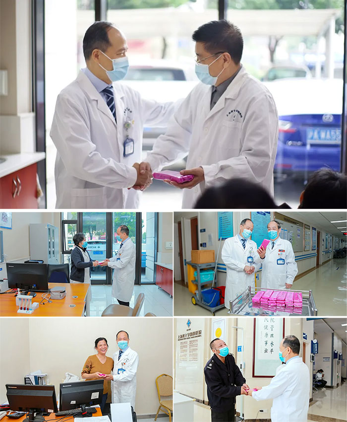 除了看望住院老年病患,院领导还亲切慰问了坚守岗位的老专家、教授,后勤职工,“感谢你们为医院这些年来辛勤的付出,你们辛苦了!”,并将一块块暖心的重阳糕送到他们的手中。