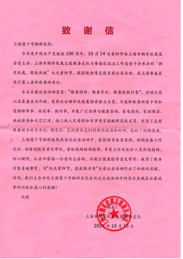 收下致谢信后,我院领导对本次公益活动主办方领导给予的肯定和信任表示感谢,并表示上海蓝十字脑科医院将一如既往地积极履行服务国防、服务军队、服务优抚对象的社会责任,支持国防建设。