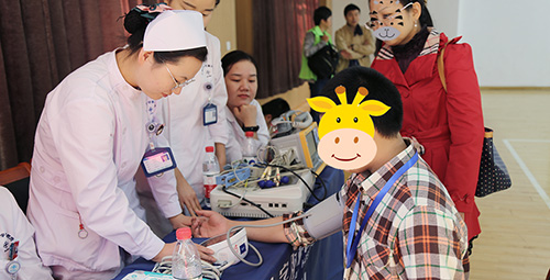 ▲运动会过程中,医务人员仔细为孩子测量血压