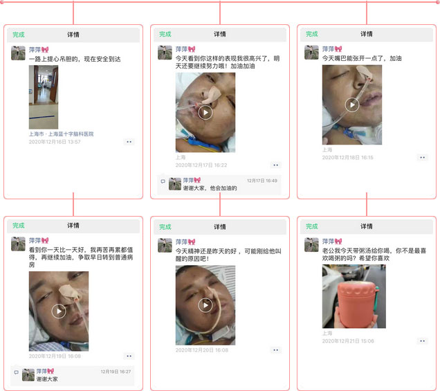 细心的冯凰芬,每天都会认真地记录丈夫莫钢廷在蓝十字脑科医院病情的发展变化,并将其分享给一直关心和牵挂丈夫的家人、朋友、队友及社会各界好心人,好让他们安心。12月16日顺利抵达上海蓝十字脑科医院,入院后的第二天丈夫就摘掉了呼吸机,并半睁眼睛;第三天嘴巴已能微微张开;第四天听到妻子的呼唤,能用眨眼应答……