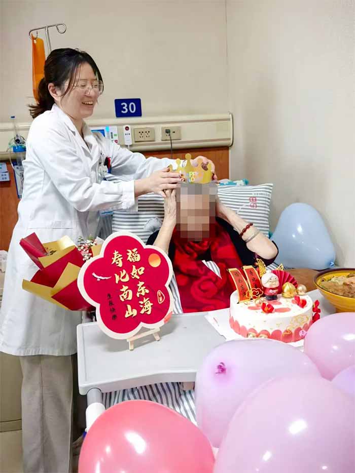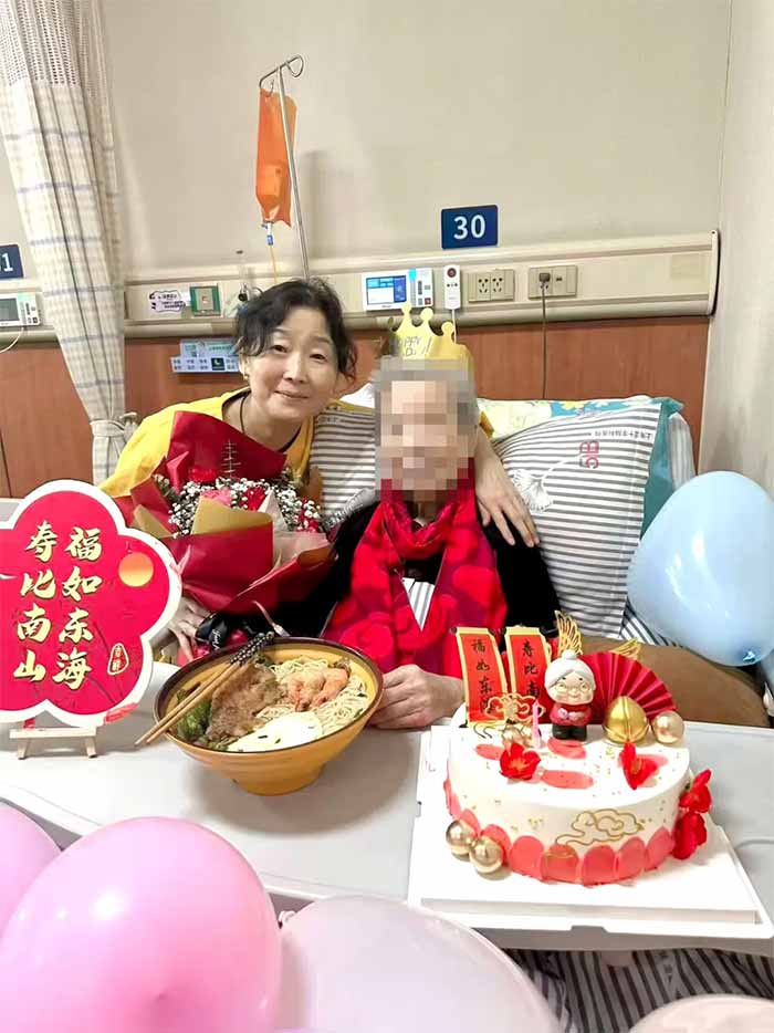生日当天,我们推着护理车走进病房,车上没有药瓶,而是一碗刚刚煮好的长寿面,上面卧着荷包蛋,撒着青翠的葱花。病房里装点着淡粉色的气球,一束康乃馨静静放在床头,处处透着家一般的温馨。
