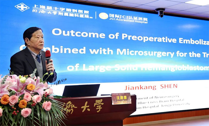 蓝十字沈建康教授作为第一位讲者,作了《术前栓塞联合显微手术治疗大实体性血管母细胞瘤的疗效观察》报告分享。他以6例临床典型病例为切入点,结合国内外相关研究,分享临床经验及心得体会,指出术前栓塞确为减少LSHB术中出血的有效方法。