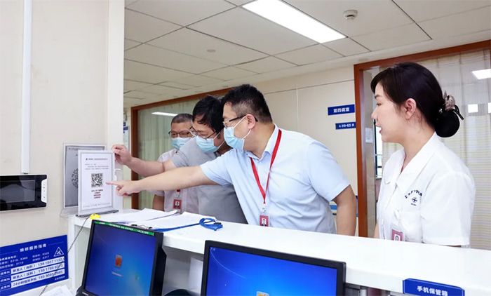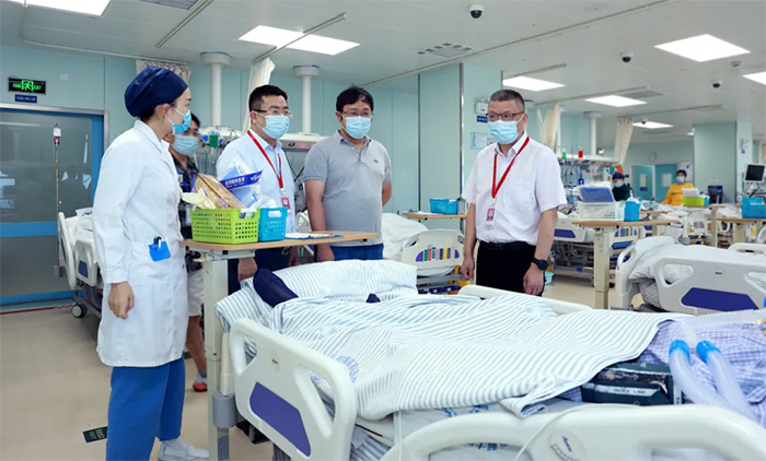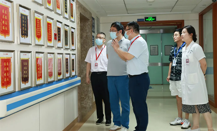 王晓东主任实地深入医院手术室、9F重症医学科、7A神经内三科及示教室、电子阅览室、党建文化走廊等区域参观。参观过程中,朱敏总经理向王晓东主任介绍了医院临床教学、文化内涵、运营管理、满意度测评、优质服务等方面工作建设情况。