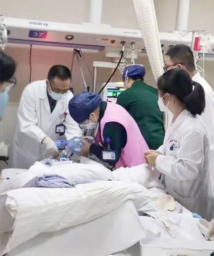 1月8日15:03分,8A病区,一位68岁女性脑梗、新冠感染患者,突发心率骤降至52次/分,血压70/41mmHg,血氧测不出。见状,张庆成主任团队李向明医生、吴文文医生、黄加佳护士立即对其进行抢救,进行胸外心脏按压及异丙肾上腺素静推,经过一系列紧急抢救,15:15分,患者心率恢复至98次/分,血压107/66mmHg,血氧饱和度92%,患者成功脱险。闻讯而至的家属,也是由悲转喜,十分感谢。