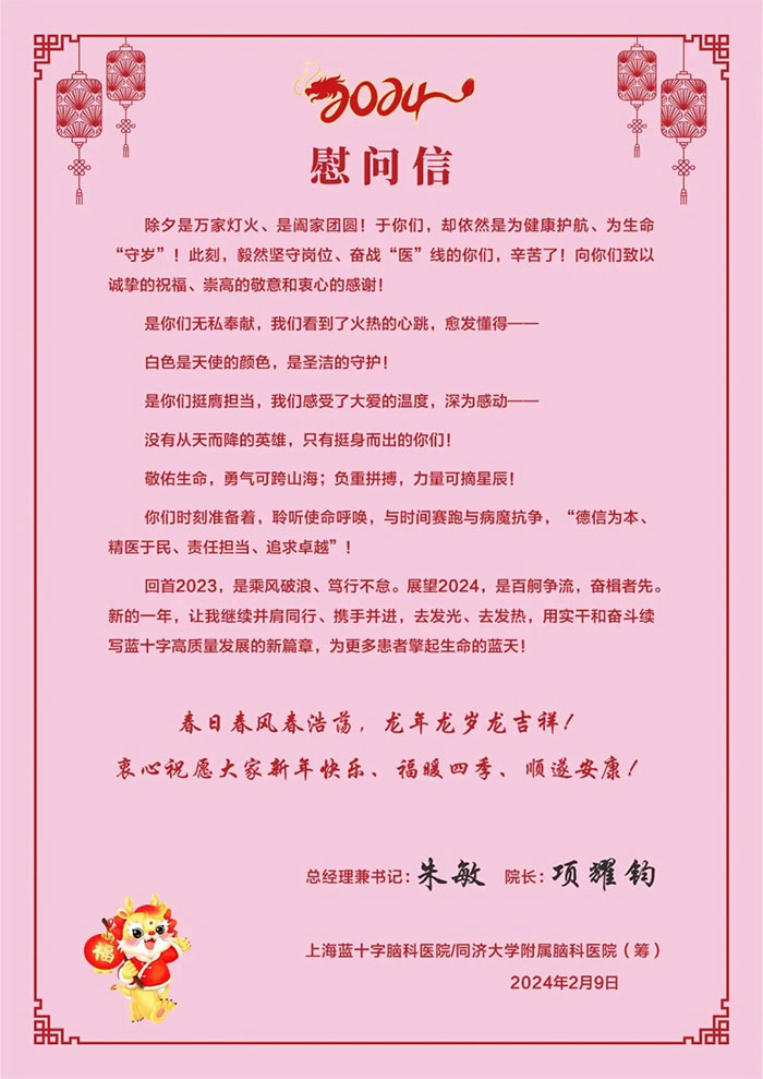 万家灯火是除夕,守岁团圆在此间。然而,在上海蓝十字脑科医院仍有许多医护人员和行政后勤职工在岗,没有回家与亲友团聚,他们在值班岗位上迎接龙年新春。对于他们而言,“患者平安健康,就是年。”