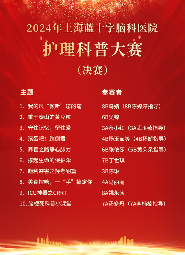 根据既定安排,决赛将根据评委打分,选出一等奖1名、二等奖2名、三等奖3名,最终获奖名单将于今年“5.12”护士节正式公布。优胜作品还将选送由蓝生脑科公司组织开展的科普大赛进行角逐。