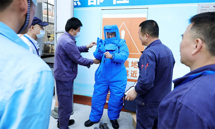 ▲ 维修组成员穿上防护服,按应急预案流程摸排转换阀门,对转换阀门检查确认