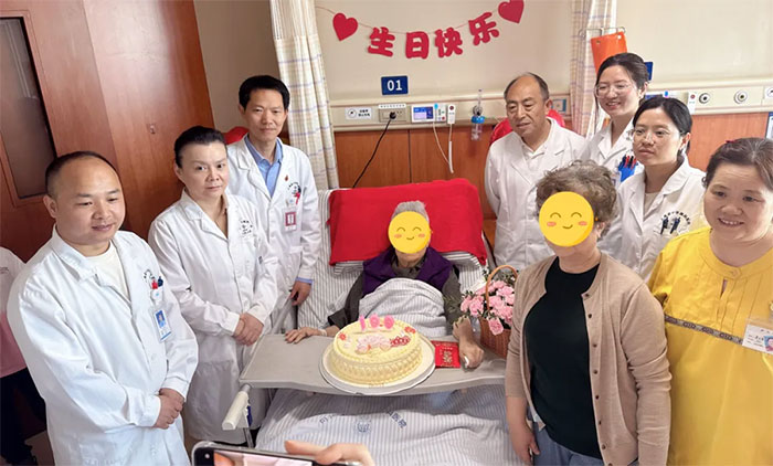 “祝你生日快乐,祝你生日快乐......”5月2日,5B神经内二科病房温馨而又热闹。当天是患者邬阿婆的百岁生辰。李振东主任、余志良副主任、黄朵朵护士长等精心布置病房,带领科室医护人员同唱生日歌,送上祝福与鲜花,为阿婆庆祝生日。阿婆脸上洋溢着幸福笑容,家属也对医护团队的悉心照料表达了由衷感谢。“有时去治愈,常常去帮助,总是去安慰”,在蓝十字,这样的医患温情故事经常上演。他们以爱为底色,将节日的温暖守护与陪伴传递,使医疗更有情怀,人文更有价值。