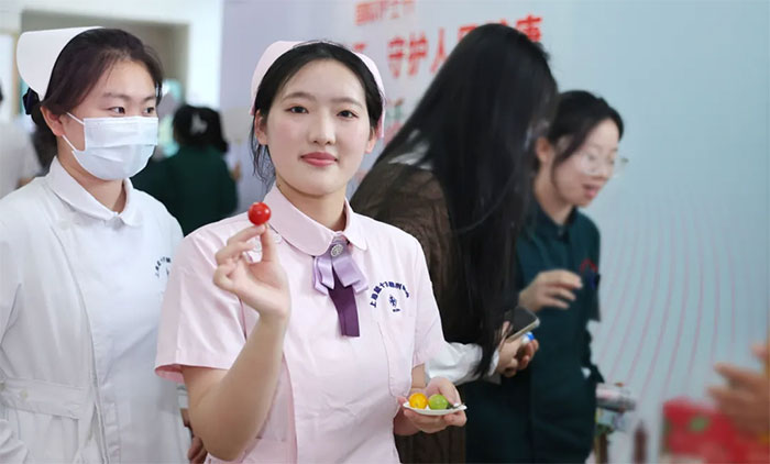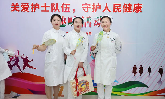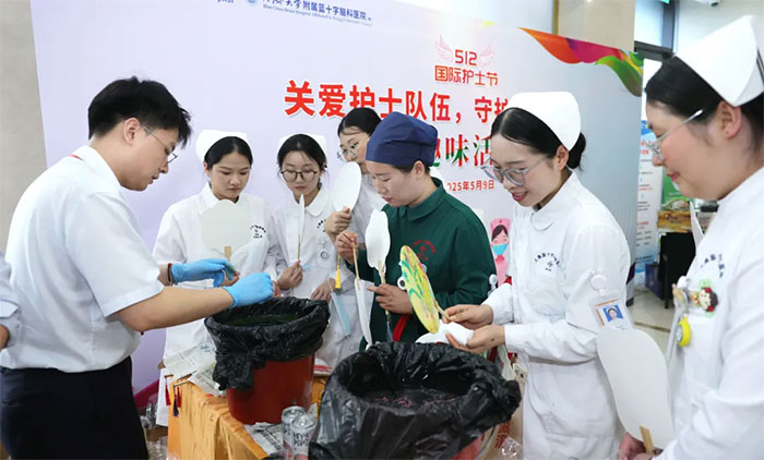 投壶场上,护士们瞄准目标,每一次精准的投掷都赢得了围观者的喝彩;套圈区内,大家争相尝试,每当圈中奖品,现场便响起一片欢呼声。还有非遗漆扇体验、时令鲜果品鉴......丰富多彩的活动,让现场迅速热闹起来,欢声笑语弥漫在每一个角落。银行工作人员与医护一道,共同在轻松愉快的氛围中收获满满,度过了一个开心而难忘的护士节。
