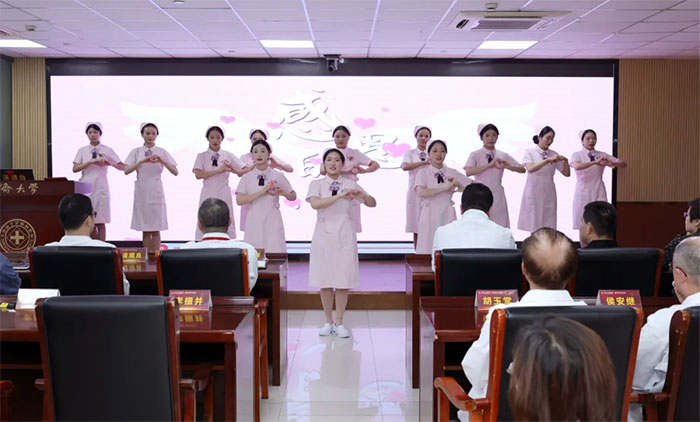 随后,护理人员以手势舞形式倾情演绎《感恩的心》,灵动的手势与温暖的旋律交相辉映,生动展现了护理团队对生命的敬畏和守护、对护理事业的热爱和奉献。她们勇担责任与使命的信念感,及在临床一线、日常护理工作中的坚韧与担当,仿佛跃然眼前。
