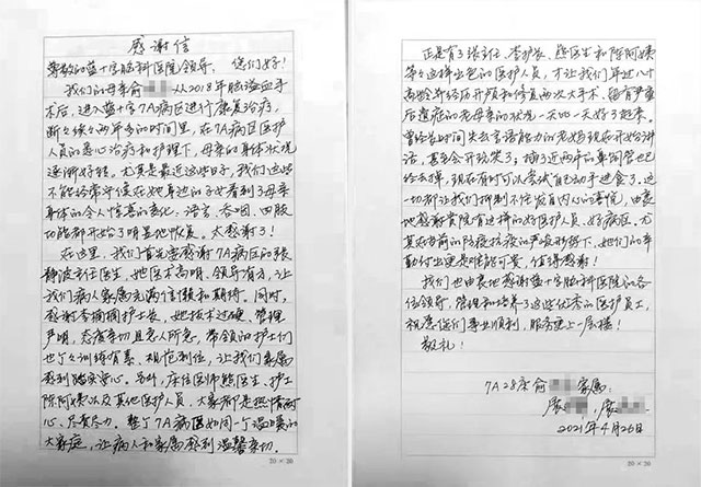 当收到家属的感谢信,张主任表示,一个患者病情的好转,除了医生的专业治疗,也离不开护士、护工们的精心护理与悉心照料,更离不开患者与家属的支持与信任,是医患共同配合努力的结果。