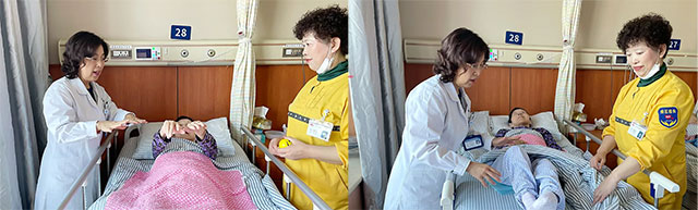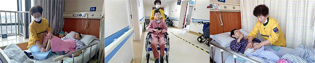 俞阿婆因为脑出血手术及之后颅骨修补手术已断断续续在蓝十字治疗较长时间了,一直都是陈金娣照料的,她像亲人般地照顾着她,事无巨细。不仅要帮她擦身、洗脚、洗脸、梳头、换尿不湿,还会主动陪她聊天唠家常,给她唱歌,哄她开心……每天还会定时让俞阿婆坐上轮椅,推着她在病房、病区走廊散散步,只要对她身体恢复有好处的事情,陈护工都会尽心尽力去做。