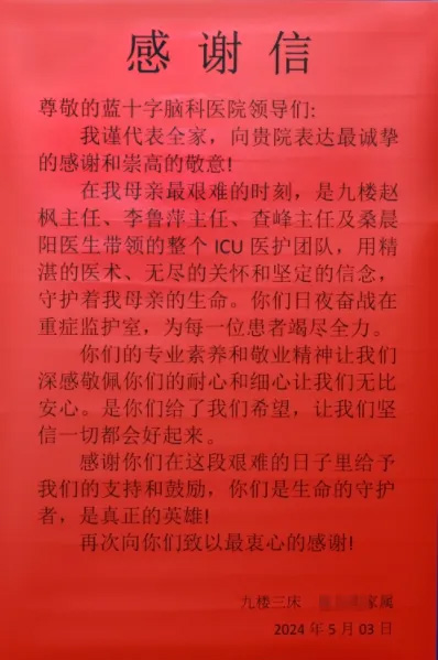 在患者最无助的时候,正是神经外科重症监护9F病区全体医护人员以精湛的医疗技术和大爱之心,为生命护航。5月3日,家属特意为团队送上了精美的锦旗和红彤彤的大号感谢信,以表最诚挚的谢意。