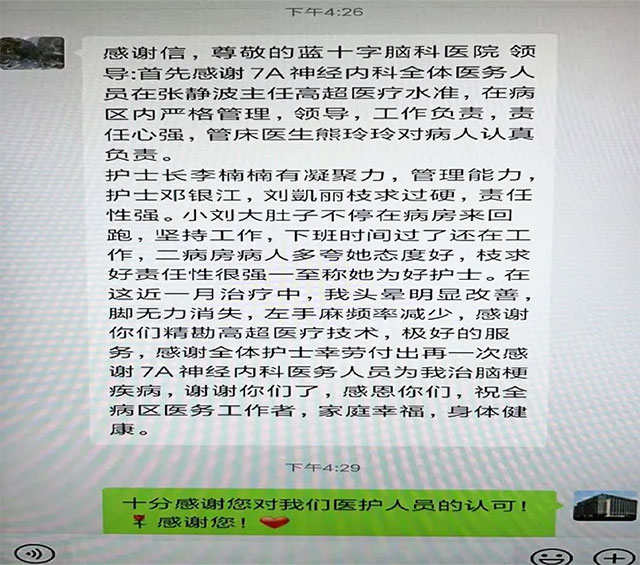 “上海蓝十字脑科医院的护士们真的很敬业,在护士长李楠楠的带领下,感觉大家都很和谐而且有凝聚力。我在医疗行业医院待了大半辈子,看惯了各种医生、护士们关系,你们这边的护士真的认真负责。比如有一段时间,由于我肢体麻木,让我心情非常抑郁。尤其是躺久了想要起来坐会的时候都很费劲,心中不免有了些懊恼。就在这时,护士长李楠楠看到我的状态后,跑过来扶我坐起,而满脸笑容的她,让我心情瞬间变好,心头涌上一股暖流。记得有天当我感觉头有点晕的时候,护士长李楠楠亲切地跑过来,仔细地询问我的感受,就像亲人一样仔细询问我的身体状况。因为在别的地方看病的时候,一般护士检查完没问题后,会来句‘都正常’就走了。但是护士长李楠楠让我感受到了比亲人更亲的情感,我真的有被暖到了!”
