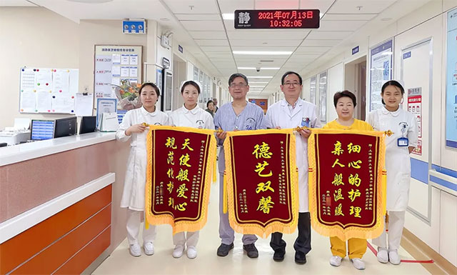 “德艺双馨”;“天使般爱心,规范化护理”;“细心的护理,亲人般温暖”——7月13日上午,周先生(化名)代表自己和同样正住院治疗的爱人徐女士(化名),为上海蓝十字脑科医院神经内科5A病区全体医护人员和护工送上了三面精美的锦旗,由衷感谢病区李振并主任和秦忠智医生团队、侯桂珍护士长带领的护理团队及护工李庆华等的优质服务和贴心关怀。