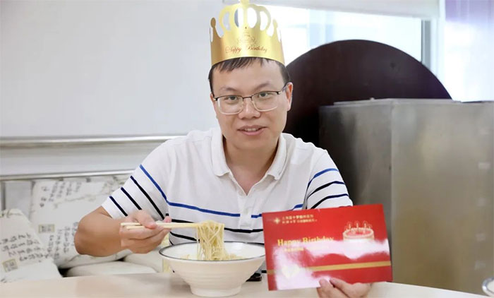 日月轮转,转眼间又老一岁。医务科科长朱细海表示这是他步入蓝十字的第八个生日,第一次参与集体生日会,非常开心。他还对工会和宣传科工作人员的精心准备表示感谢,也借此祝福今日一同吃寿面品蛋糕的寿星们生日快乐。