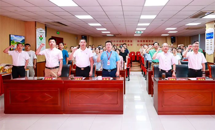 紧接着,在副院长潘耀良的领誓下,全场重温《中国医师宣誓誓词》。“我志愿献身人类的健康事业,自觉维护医学的尊严和神圣......”庄严有力的宣誓振奋人心、催人奋进,既是医者初心与责任的表达,也进一步坚定了大家终身追求医学事业的信念与理想。