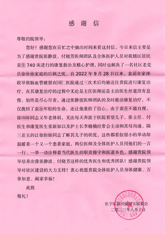 您好!感谢您在百忙之中抽出时间来看这封信,今日来信主要是为了感谢贵院张静波、付晓芳医师团队及全体医护人员对我辖区居民袁先生(740床)进行的康复救治和精心护理,同时也解决了一名社区老党员徐阿婆家庭的后顾之忧,自2022年9月28日以来,袁先生在家摔跤导致脑血管破裂在外院通过三次术后均送往贵院进行康复治疗,在其康复治疗过程中无论是主任医师还是主治医生丝毫没有怠慢,始终是尽心尽责,通过张静波医师团队的及时救治康复治疗,不仅挽回了袁先生年轻的生命,还让他重拾了信心,由于袁先生不能自理,徐阿婆又年老体弱,无法每天奔波于医院看望儿子,张主任、付医生和康复医生张新如以及护士长李楠楠经常会主动和其母沟通,隔三差五的让徐阿婆了解其儿子的状况,这些都看似很小的举动却温暖着一个又一个患者家庭,两位医师及全体医护人员用他们的一言行、一举一动诠释着当代医生的职责操守和医道本色。感谢贵院领导培养出像张静波、付晓芳这样的优秀医生和优秀团队!感谢贵院领导对社区建设的大力支持!衷心祝愿贵院全体医护人员身体健康、万事如意、阖家幸福!
