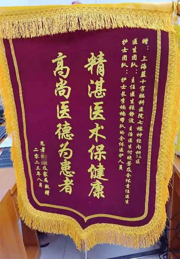 近日,患者袁先生的母亲徐阿婆和两位居委会干部来到上海蓝十字脑科医院办公室,亲手送上精美的锦旗和情真意切的感谢信,对医院神经内科7A病区张静波主任、付晓芳医生及全体医护人员表达真挚的谢意。