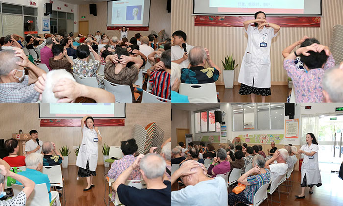 现场,李艺博士亲自示范“头部经络按摩操”,并教授口诀,这也引起了居民们的浓厚兴趣。在李艺博士的教授下,全场氛围活跃,不由自主地跟着操练。她提醒居民早晚做一遍,平时自己多做做也是极好的。预防认知症,养生保健,贵在坚持。