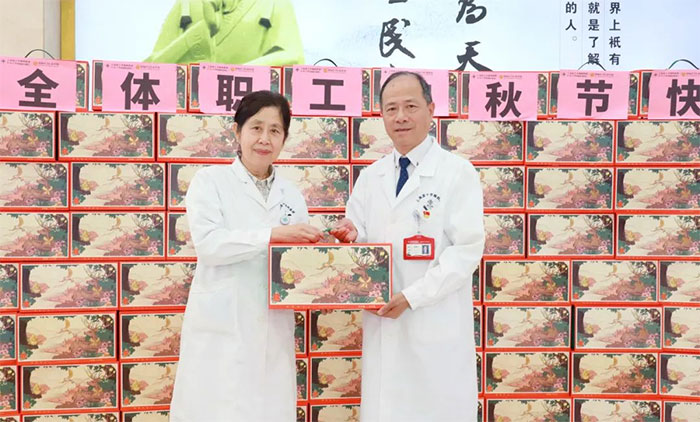 上午10点半,门诊大厅精心布局的月饼礼盒墙营造出满满的节日氛围和仪式感。总经理兼书记朱敏、院长项耀钧、副总经理兼工会主席吴春芳等院领导亲临福利发放现场,将象征着团圆、团结、美好的月饼礼盒发放到职工手中。