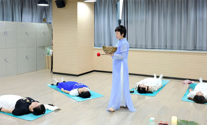 最后,是颂钵疗愈环节。大家平躺于瑜伽垫上,刘老师指导大家调整到各自最舒服的姿势,关闭繁杂的思绪。她轻轻敲击颂钵,深沉而悠扬的音律瞬间响彻整个空间,让人仿佛置身于一片宁静的天地之中。大家跟着刘老师的节奏进行61点冥想,唤醒内在的感知。此外,刘老师还带领大家一起进入七脉轮颂钵疗愈中顶轮与心轮项目的奇妙世界。她或轻轻敲击颂钵、或将颂钵放置于每个人的心轮上绕圈摩擦。独特的泛音频率,与体内分子共鸣,唤醒沉睡的能量,释放烦恼和压力,让人有回归大自然、与自然合一之感。伴随着身心的放松,大家很快进入深沉的睡眠。