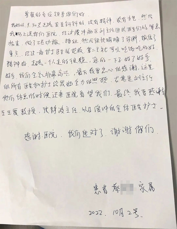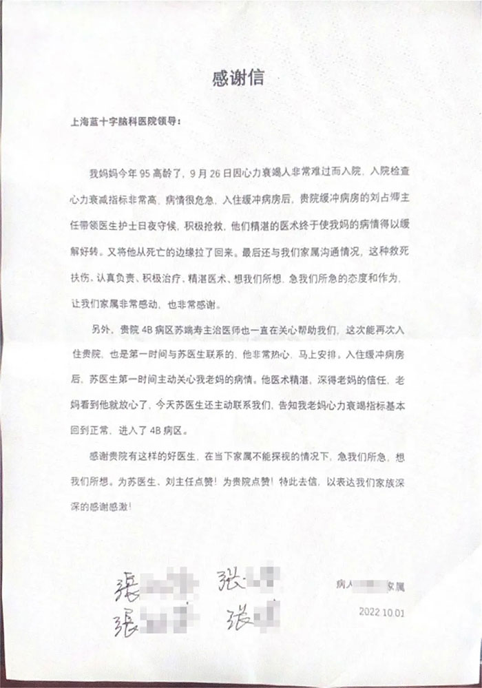 近日,上海蓝十字脑科医院院办收到了两封来自患者家属的感谢信。在朴实的语言和文字里,浸染着浓浓的信任和感激之情,不仅有对医院“健康所系、性命相托”的切身体悟和感叹,更是对医护团队的精湛医技、专注敬业、细致服务给予了赞言。