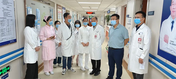 “国庆快乐!”“大家辛苦了!”.....每到一处,院领导向坚守岗位的蓝十字人送去节日的问候,实地了解节假期间的工作安排和患者诊疗情况,对大家坚守“医”线的敬业与奉献精神给予肯定和鼓励,殷切叮嘱值班人员认真值守,注重工作细节,做好节假期间的医疗安全、应急保障、诊疗服务等各项工作,为患者提供优质高效的服务。同时嘱咐大家要注意劳逸结合,确保以良好的精神状态和精湛的医疗技术护佑人民健康。