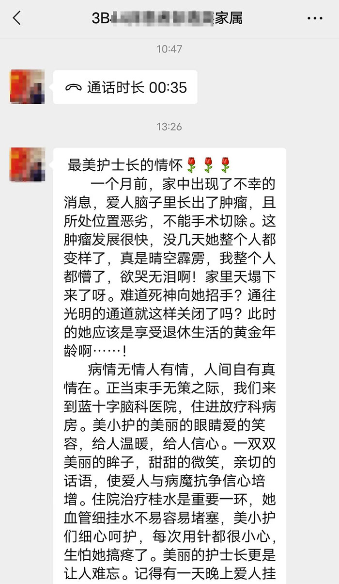 3B病区一位脑肿瘤患者彭女士住院期间,陈琳护士长带领护理团队精心护理、耐心劝慰、细致呵护,不仅解开了患者的心结,而且树立起了战胜病魔的信心,确保了患者的治疗进程,使病情得以明显好转。患者家属难以抑制心中的激动,通过微信发送千字长文感谢信,以感谢他心中这位“最美护士长”!