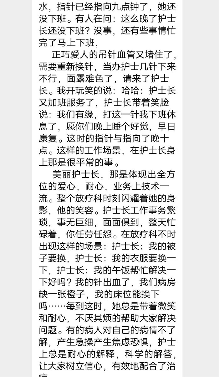 强将手下弱兵,整个放疗科护理团队精神风貌一流。在她带领下,个个闪耀着火一样的工作热情和爱心,耐心和细致。这是个爱心团队,奉献团队,人性化得到充分体现,赢得了(患者)的交口称赞……辛苦了,向你们致敬!