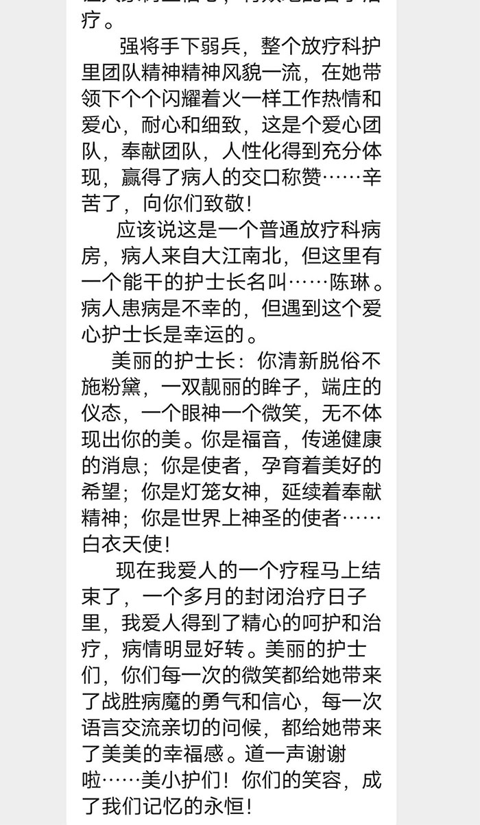 “应该说这是一个普通放疗科病房,患者来自大江南北,但这里有一个能干的护士长名叫——陈琳。患者患病是不幸的,但遇到这个爱心护士长是幸运的!”