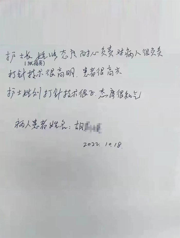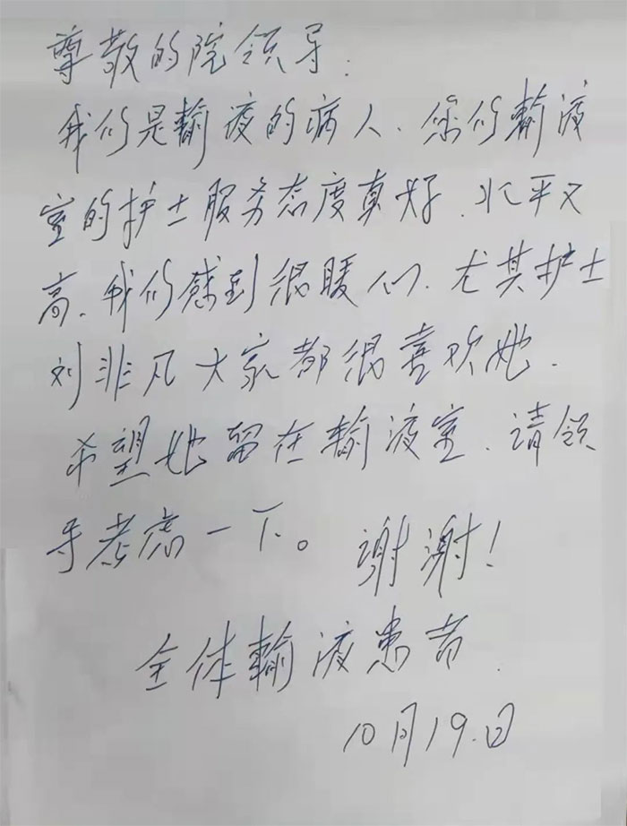 “我们是病友,非常感谢吊针室的张小姐和刘小姐小姑娘,希望领导在开会时特别要表扬一下......”