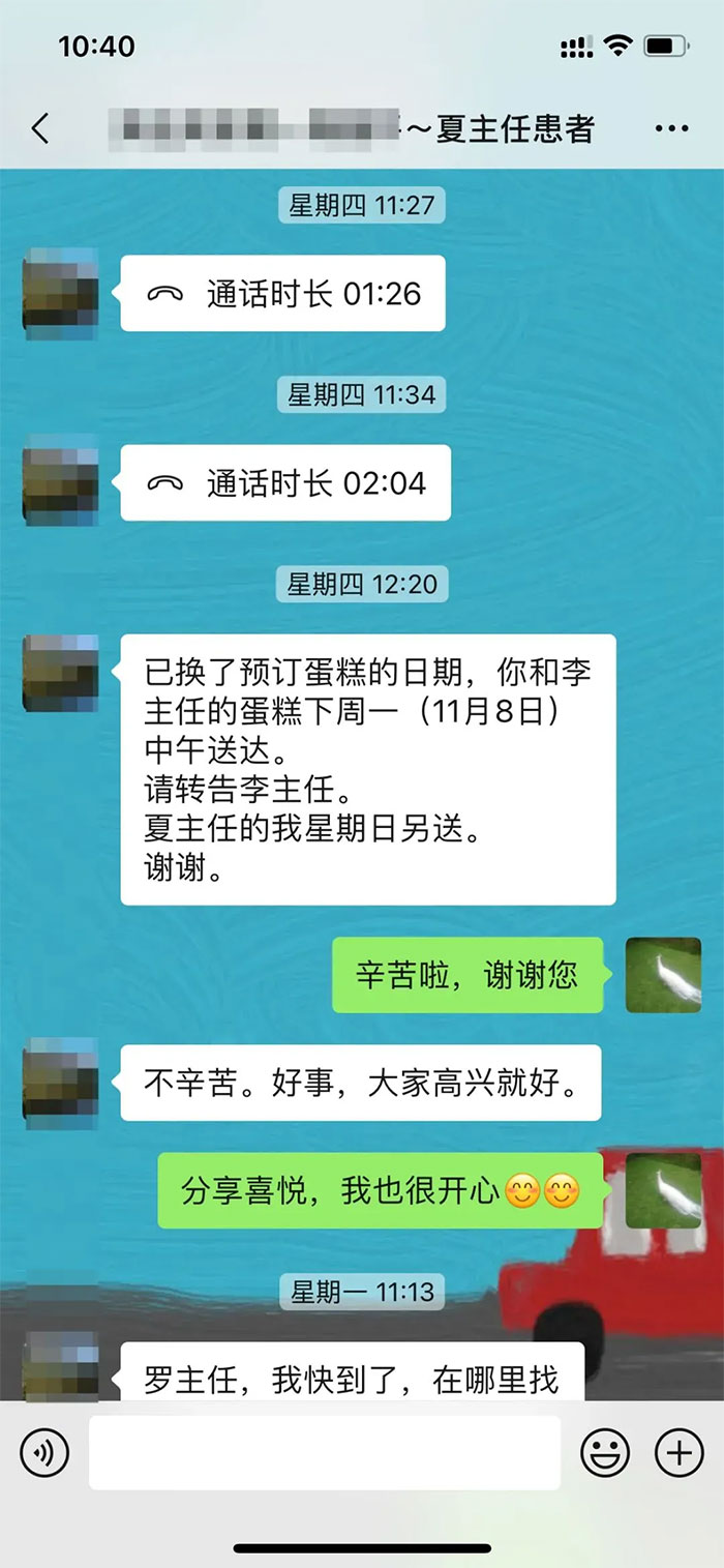 杨先生时常通过电话、短信等形式与李振并主任、夏瑾玮医生沟通母亲的病情。虽然平日里业务很繁忙,两位专家还是非常理解杨先生的孝心,不厌其烦地告知治疗进展,并安慰他“放宽心”。