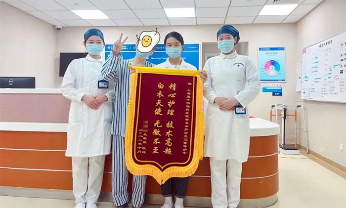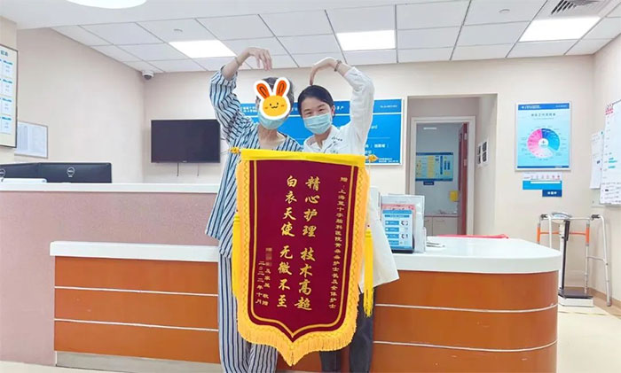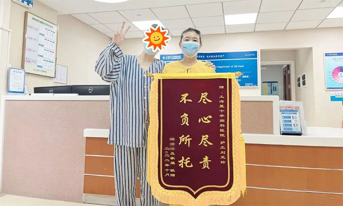 金秋十月,72岁的患者樊阿姨终于迎来了康复出院的好消息。临出院时,樊阿姨特地托人定制了精美的锦旗,亲手交到护士长黄朵朵和护工刘元玲手中,感谢科室医护人员在住院期间给予她“不是亲人,胜似亲人”的精心照护。