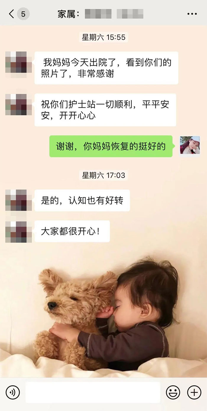 平日里,由于家属无法前来探视,老人倍感落寞。护理团队便会不定期地组织相邻“病友”一道,有时“拉拉家常”,有时做一些浅显易懂的科普宣教。对于樊阿姨在康复中点点滴滴的进步,护士长都记在心里,一有空就及时与家属沟通,贴心周到的护理,让患者家属感到满意。