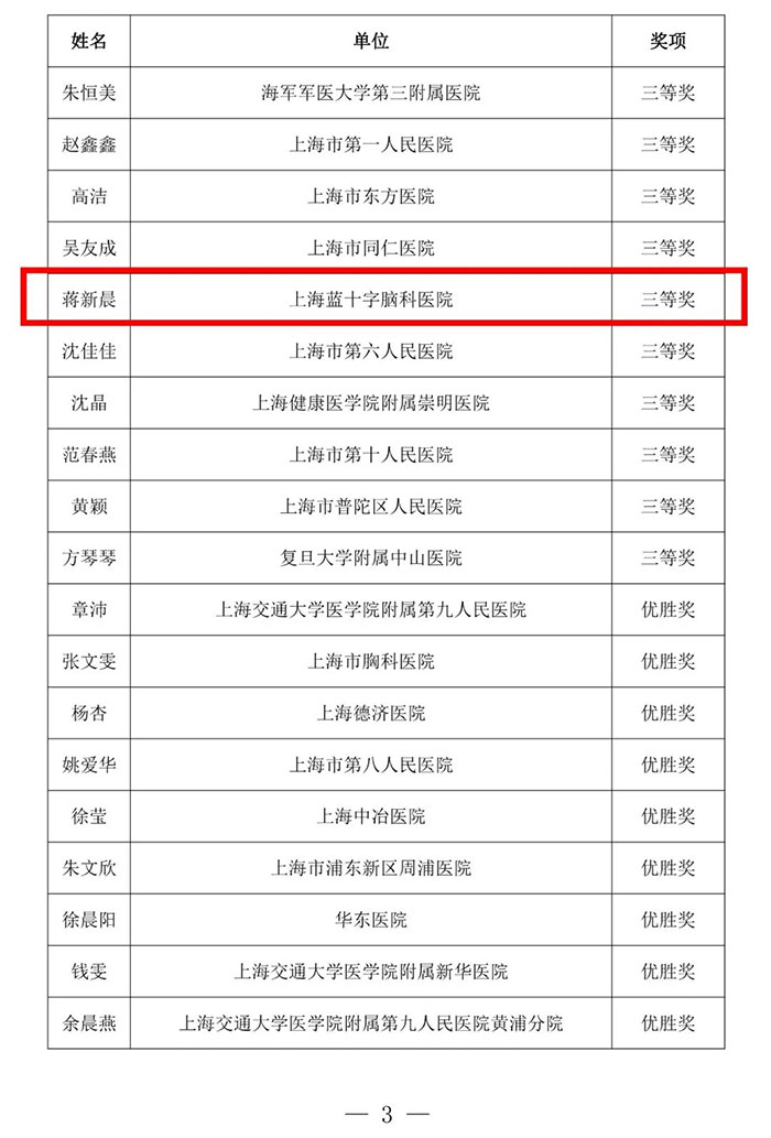 今年是上海市护理学会成立一百周年。为纪念上海护理百年历程中的感动瞬间,弘扬传承护理职业精神,上海市护理学会组织开展了“薪火传承百年路 仁心笃行续华章”护理故事演讲比赛。来自全市111项参赛作品进入初赛,入围现场演讲46项。结合演讲主题与内容及15位专家评审意见等,上海蓝十字脑科医院脑血管病科护士蒋新晨荣获比赛三等奖。