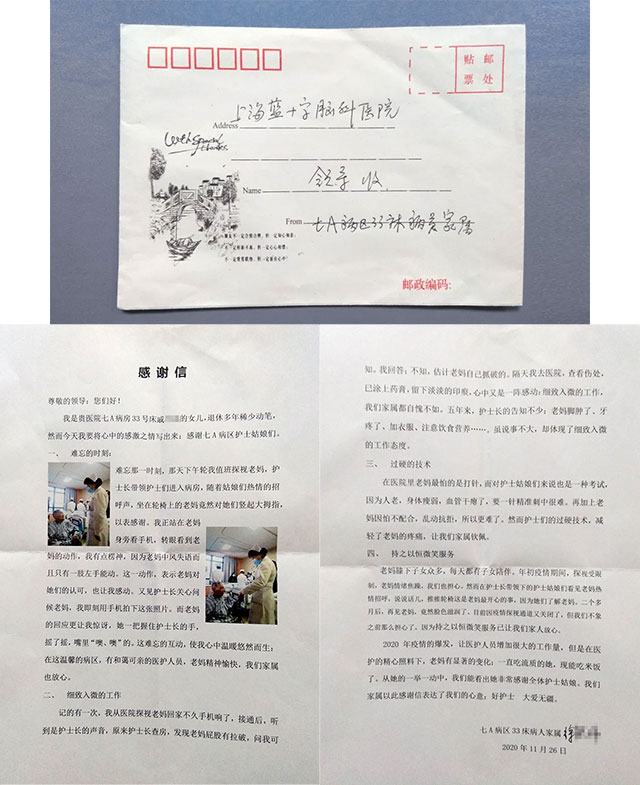 11月26日,上海蓝十字脑科医院神经内科7A病区护士站收到了一封来自33床患者戚阿婆女儿徐女士的感谢信,她要特别感谢李楠楠护士长及其带领的7A护士团队,是护士们的默默守护与悉心护理才有了其母亲今日的神采和康健。