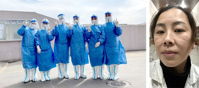 接近零下的气温,密不透气的防护服,四面迎风的采样大厅,密密麻麻的候检人群。从12:30一直奋战到近20:00,李兰馨和队员们顾不得上厕所,更不敢喝水、吃东西。膝盖冻僵了,耳朵磨破了,面颊也被勒出了血痕……当看到采集的600余例核酸样本时(李兰馨个人采集200余份),这一切都已显得不那么重要了,所有人的脸上只剩下大写的满足。