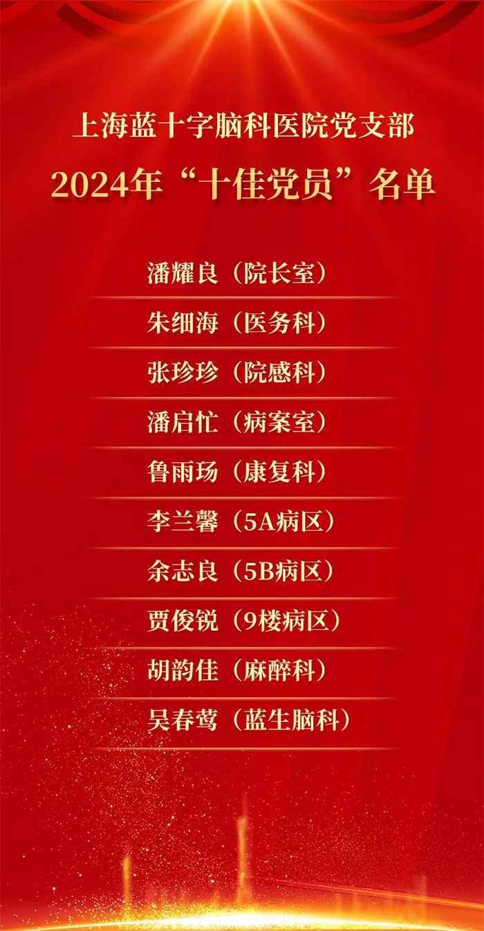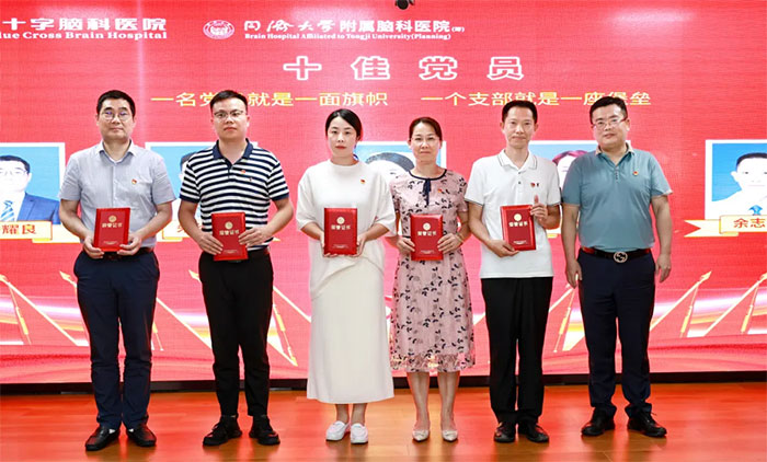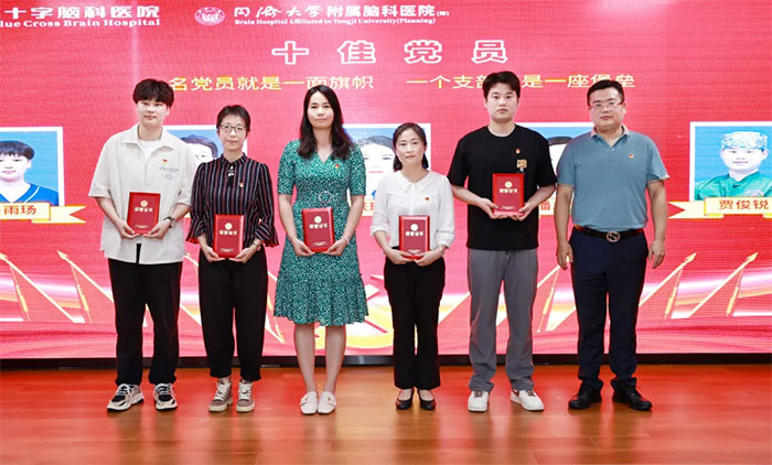 赵宇兰副书记宣读表彰决定,中共上海蓝十字脑科医院支部委员会经过认真评选和审议,决定对在医院工作中表现突出的潘耀良、朱细海、张珍珍、潘启忙、鲁雨玚、李兰馨、余志良、贾俊锐、胡韵佳、吴春莺等十位党员进行表彰,授予他们“十佳党员”荣誉称号。