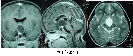 颅咽管瘤是指发生于颅咽管残余上皮细胞的肿瘤,是常见的先天性肿瘤,约占60%,占颅内肿瘤的5%—6%。为良性肿瘤,可见任何年龄,以儿童及青年多见,男女比例约为2:1。临床表现主要为头痛、呕吐、视力减退、视野缺损及视神经萎缩;发育迟缓,性功能障碍,女性月经不调、闭经、不孕,男性性欲减退、阳萎;体温调节失常、多饮、多尿、消瘦、精神异常;向邻近生长者可有偏瘫、感觉减退等相应压迫症状、体征。手术治疗为首选,年龄越小,越易全切,并发症越少,故早诊早治是关键。