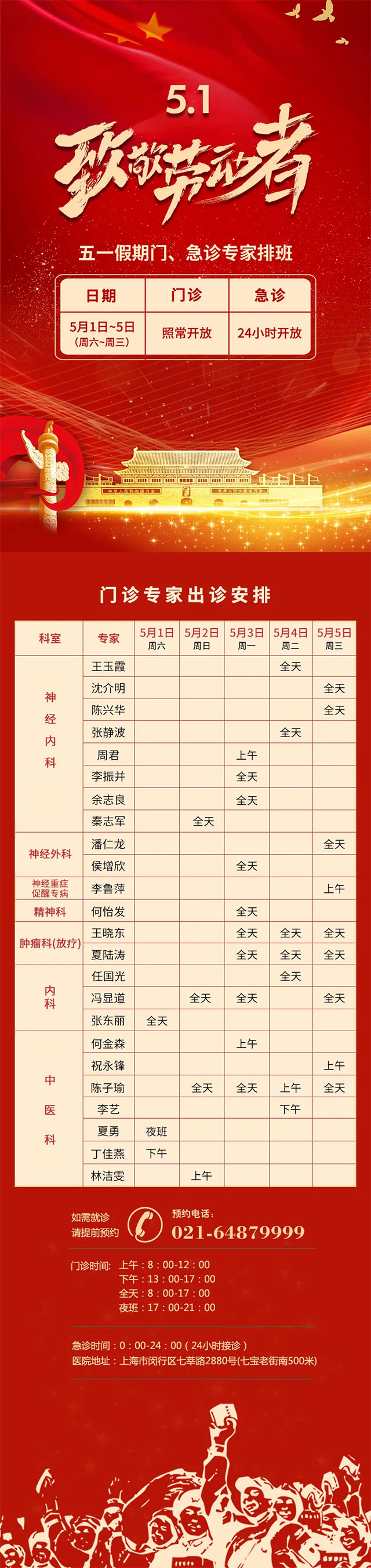 目前,疫情防控工作仍不容松懈,请您来院就诊时务必做好个人防护,全程佩戴口罩,主动配合医务人员进行体温监测、流行病学调查、出示随申码、行程码等预检分诊工作;新入院患者及陪护须提供7日内新冠病毒核酸检测阴性报告办理入院。最后,上海蓝十字脑科医院向所有辛勤奉献的劳动者致敬!祝大家五一劳动节快乐!