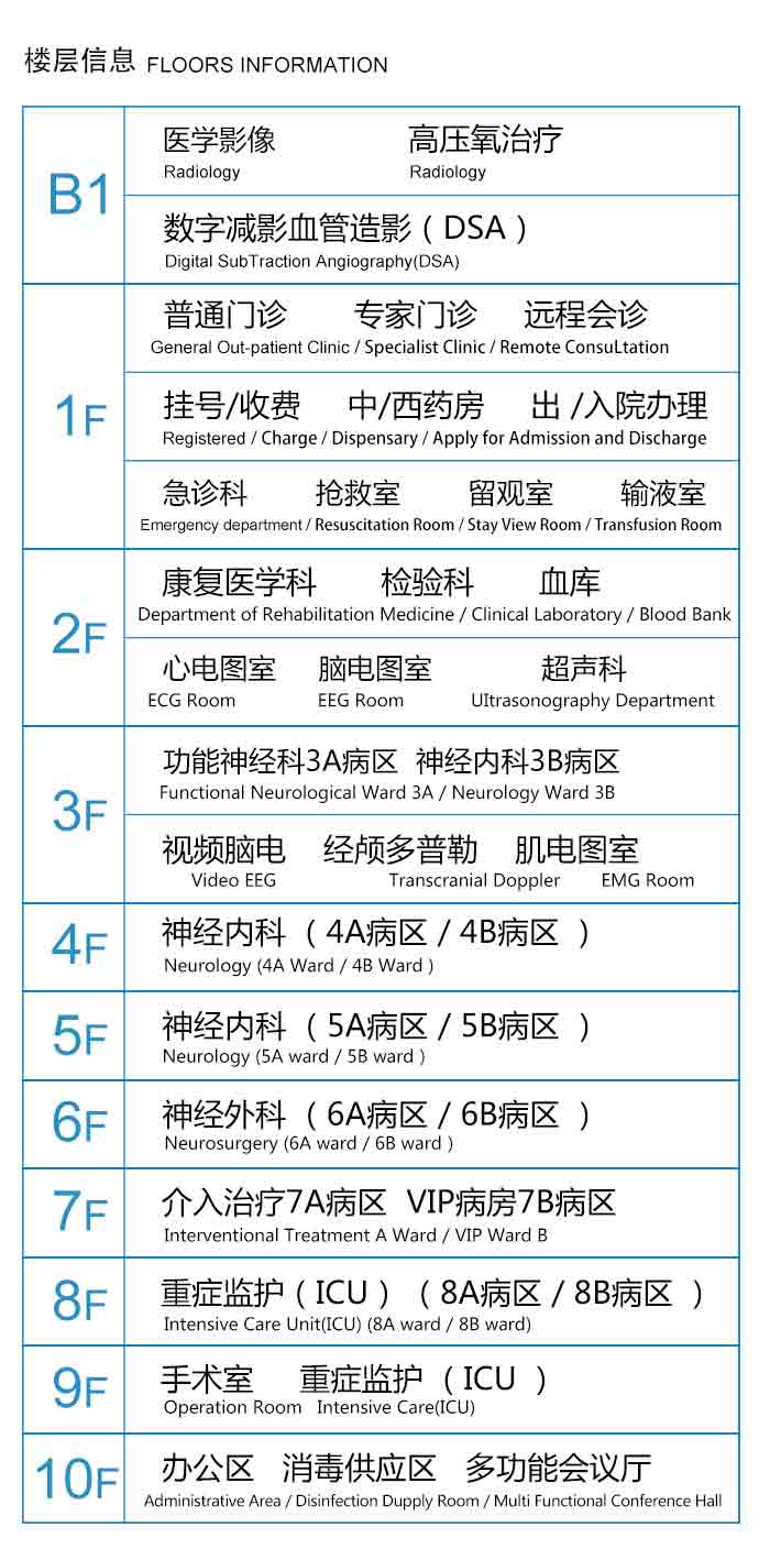 2楼:康复医学科、检验科、血库、超声科、经颅多普勒、心电图室、脑电图室、肌电图室