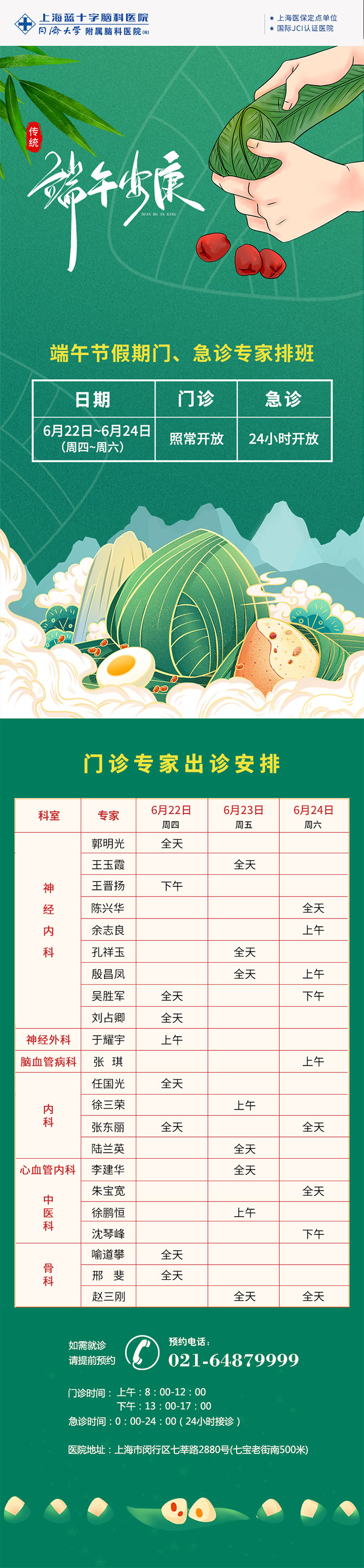 2023年端午节即将到来,为方便广大市民朋友就医,我院于端午节期间:6月22日-6月24日(周四-周六)门、急诊照常开诊。具体排班公告如下: