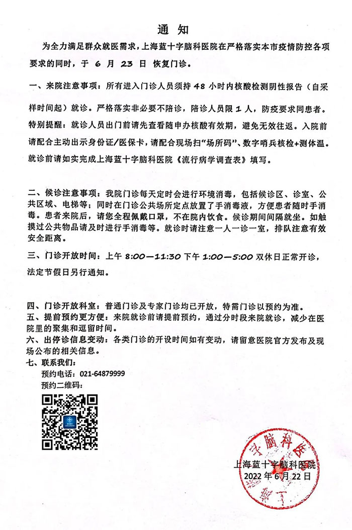 根据国家和本市疫情防控要求,经上级主管部门批准,自2022年6月23日上午8时起,上海蓝十字脑科医院恢复门诊服务工作。