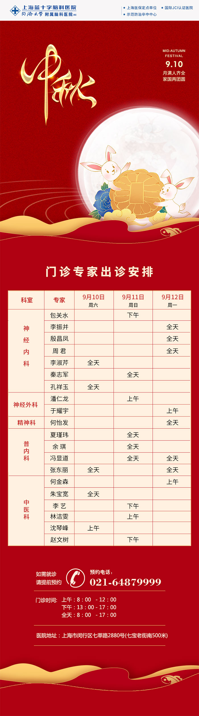 根据国务院节假日放假通知精神,结合医院实际情况,我院2022年中秋节假期间(9月10日-9月12日),门诊工作安排如下。